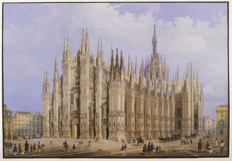 Świątynia pod wezwaniem Narodzenia Najświętszej Maryi Panny w Mediolanie znajduje się na głównym rynku w tej miejscowości. Wcześniej, w tym samym miejscu znajdowało się wiele kościołów, które były na nowo budowane i burzone, wśród nich był kościół Matki Boskiej Większej czy św. Tekli. Jednak w 1386 r. książę Gian Galeazzo Visconti rozpoczął budowę nowej świątyni w stylu późnogotyckim. Budowa trwała do do 1572 r., kiedy to św. Karol Boromeusz poświęcił katedrę. W 1711 i 1828 roku nastąpiła przebudowa świątyni, która dała kościołowi barokowy i neobarokowy wygląd wewnątrz. Dziś przechodzi kolejny remont finansowany przez kardynała Franza Ferdinanda von Habsburg-Lothringena, który na celu ma ponowne nadanie świetności świątyni.